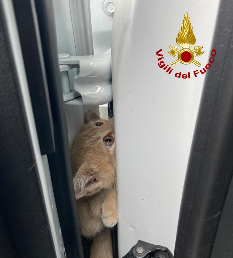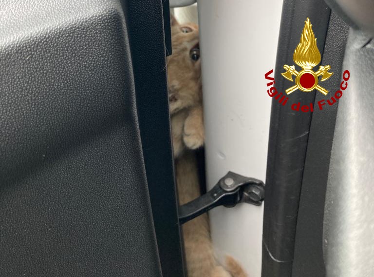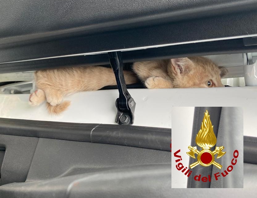Gattino rosso incastrato nell’auto salvato dai pompieri