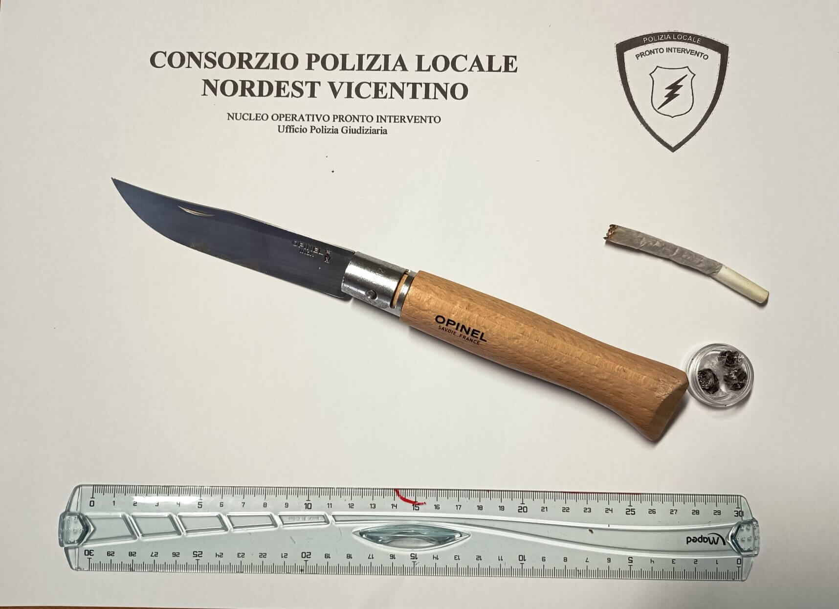 Il 2 aprile scorso, a Villaverla, agenti hanno proceduto al controllo di due uomini che fin da subito hanno manifestato un atteggiamento ingiustificatamente agitato e nervoso, elemento che ha indotto gli agenti ad approfondire gli accertamenti. A seguito della situazione delineatasi, è stata eseguita anche una perquisizione al termine della quale uno dei due, 21enne del posto, è stato trovato in possesso di un coltello con lama in acciaio di 12 centimetri, nonché di tre involucri contenenti hashish.