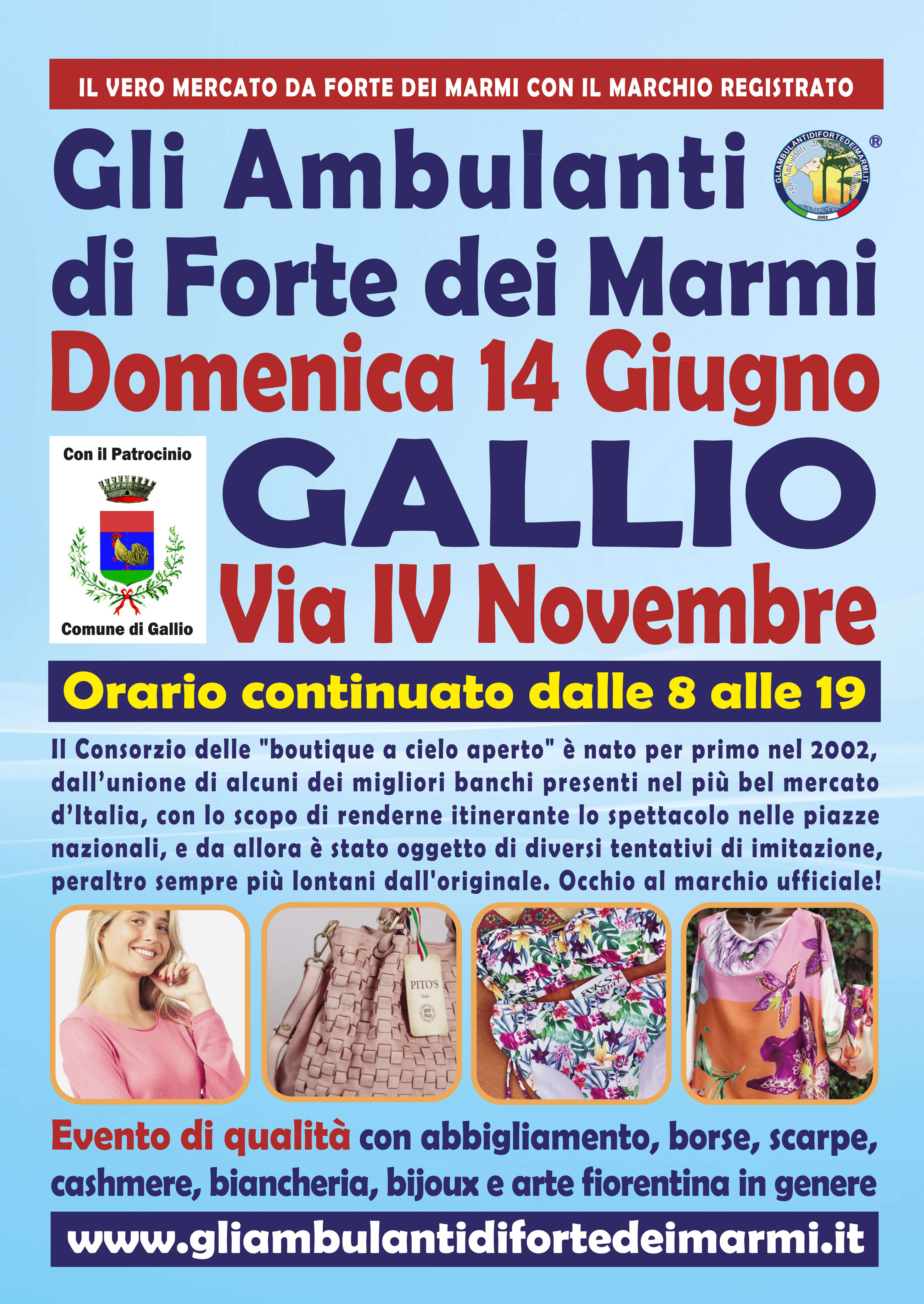 Speciale ed esclusivo appuntamento con l’evento-mercato più famoso d’Italia. Voglia di estate, di svago e di normalità e così ritorna a grandissima richiesta a GALLIO l’eccellenza dell’unico vero ed originale mercato di qualità de “Gli Ambulanti di Forte dei Marmi”.Lo spettacolo delle famosissime “boutique a cielo aperto” – con il meglio del Made in Italy artigianale, come pelletteria (borse e scarpe) di unica ed esclusiva fattura artigianale, la migliore produzione di cachemire, nuove collezioni moda, tessuti di arte fiorentina e tanta qualità garantita dal Consorzio al prezzo migliore – Vi aspetta domenica 14 giugno a GALLIO nella consueta location estiva di Via IV Novembre.Dunque, una giornata da non perdere assolutamente per i tantissimi appassionati dell’originale Consorzio della zona! Sarà la festa dello shopping più glamour e conveniente, con orario continuato, anche in caso di maltempo, dalle 8 alle 19.