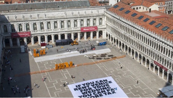 Sul telo la scritta: “If you can rent Venice for your wedding, you can pay more tax” (“Se puoi affittare Venezia per il tuo matrimonio, allora puoi pagare più tasse”). L’azione ha coinvolto una decina di attivisti, che hanno voluto denunciare quella che definiscono un’“ingiustizia sociale e climatica”.