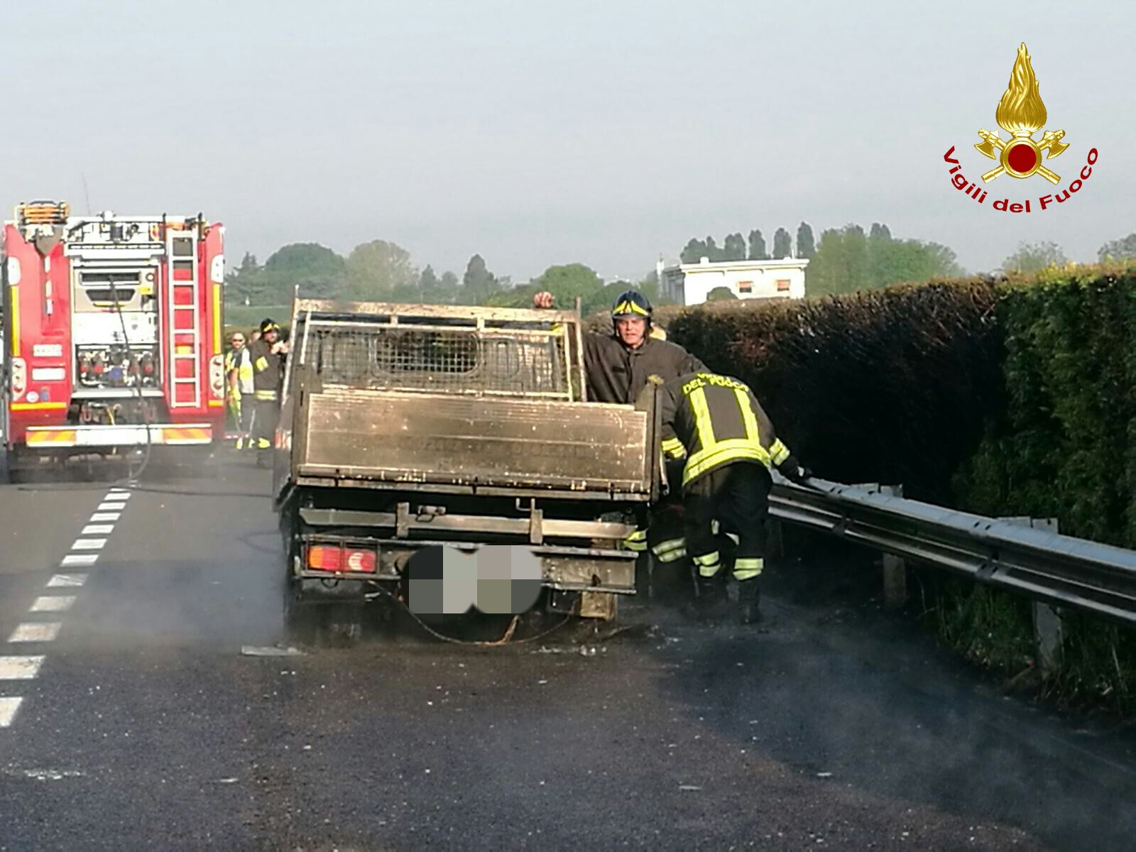 Alle 7.30, i vigili del fuoco sono intervenuti in autostrada A4 poco dopo il casello di Grisignano in direzione Milano per l’incendio di un furgone cassonato. L’autista di una ditta rodigina di manutenzione del verde, che viaggiava con due colleghi, si è accorto del malfunzionamento del furgone accostando in corsia di emergenza. Appena scesi hanno notato il fumo avvolgere il furgone e subito dopo le fiamme. I pompieri intervenuti con due mezzi uno da Vicenza e uno da Padova hanno spento l’incendio, che ha completamente distrutto il furgone. Le cause di probabile natura elettromeccanica sono al vaglio delle squadre intervenute. Sul posto il personale ausiliario dell’autostrada. Le operazioni di soccorso dei vigili del fuoco sono terminate dopo circa un’ora.