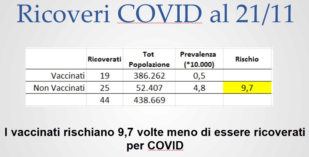 I numeri parlano chiaro. La situazione dei ricoveri nell’Ulss 8 dimostra la netta prevalenza di rischio di ricovero nei soggetti non vaccinati. Numeri chiari che comunque, purtroppo, da una fetta di popolazione non verranno compresi. Chi non è vaccinato rischia quasi 10 volte di più il ricovero rispetto a chi è vaccinato. Non solo. L’età media dei ricoverati in terapia intensiva è inferiore ai 60 anni (vedi le tabelle sotto). I dati sono stati presentati stamane nel corso di una conferenza stampa in Ulss 8 Berica dal direttore generale Maria Giuseppina Bonavina e dalla dottoressa Maria Teresa Padovan, direttore del Servizio di Igiene e Sanità Pubblica dell’Ulss 8 Berica.