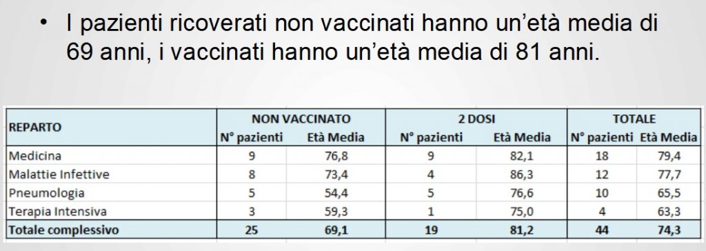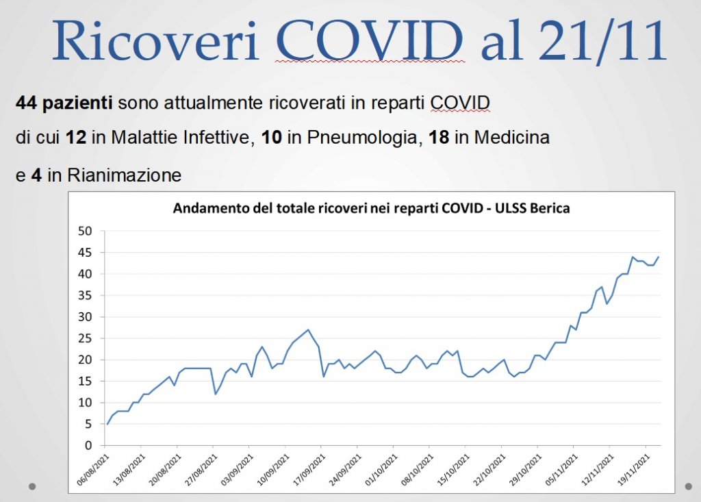 Sono 44 i ricoverati nell’Ulss 8. Di questi 25 non sono vaccinati (su una popolazione non vaccinata di 52.407 persone) e 19 sono vaccinati (su una popolazione di 386.262 persone). In terapia intensiva ci sono 4 persone. Un vaccinato di 75 anni e 3 non vaccinati con meno di 60 anni. L’età media dei ricoverati vaccinati è di 81 anni, quella dei non vaccinati è di 69 anni.