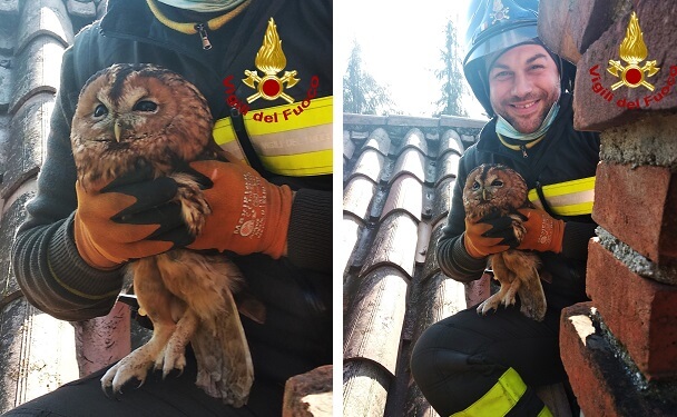 I pompieri salvano un allocco incastrato in una canna fumaria