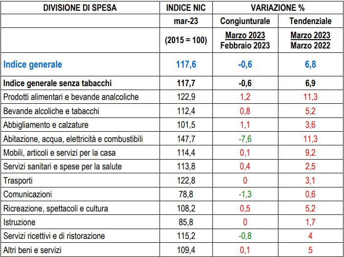 Marzo 2023, indici e variazioni percentuali (base 2015=100)