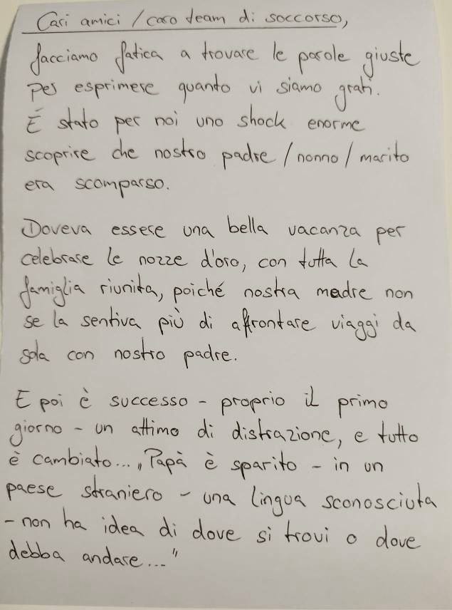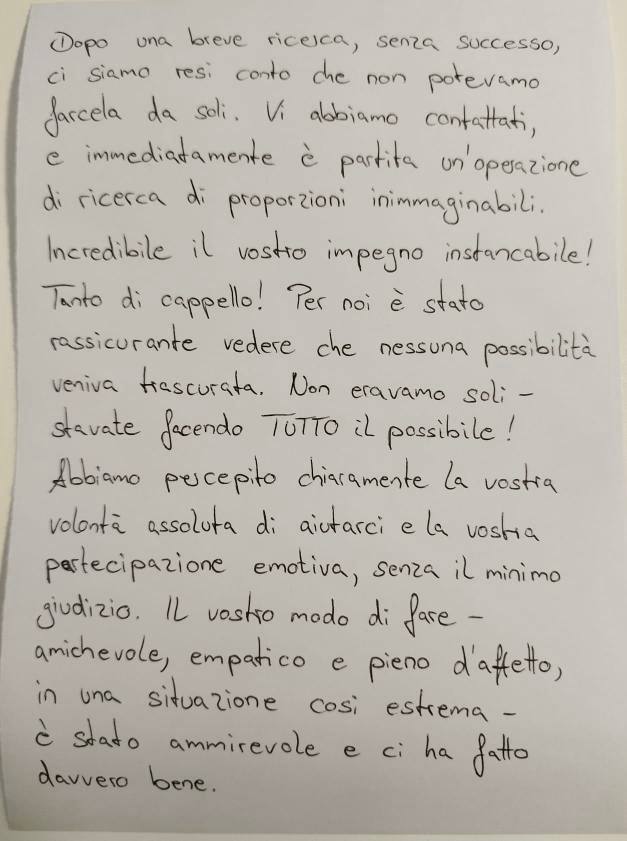 Una lettera di ringraziamento da parte della famiglia, ricevuta dai soccorritori, sottolinea la professionalità, l’empatia e l’impegno instancabile delle squadre coinvolte nelle ricerche.