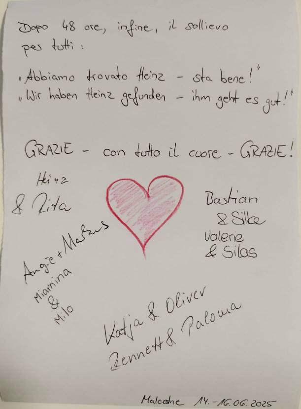 Con queste parole, i Vigili del fuoco e i soccorritori impegnati nelle ricerche hanno annunciato il lieto fine del caso di Heinz, il turista tedesco di 72 anni scomparso il 14 giugno scorso nella zona di Malcesine (VR). La notizia è stata comunicata ai familiari, che da giorni attendevano con apprensione sviluppi sulla sorte del loro caro.