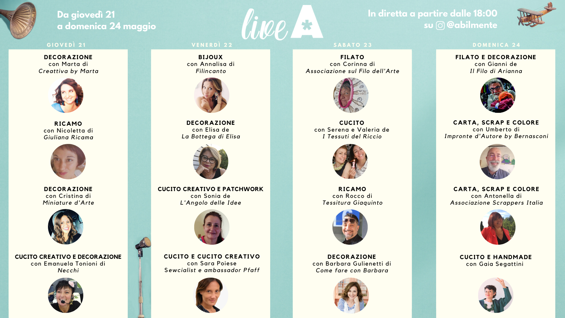Un ricco palinsesto (vedi infografica allegata) che proseguirà poi lungo l’arco del weekend e che, tra gli altri, fissa nella giornata di sabato l’appuntamento live con Barbara Gulienetti, uno dei volti più noti del fai da te in Italia e special guest delle edizioni autunnali 2019 di Abilmente nell’area “Come fare con Barbara”. Domenica, la diretta conclusiva ospiterà anche Gaia Segattini, madrina del progetto “Cucito su di te” e apripista della creatività italiana al femminile con il suo blog @vendettauncinetta.