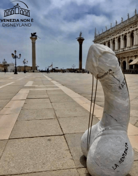 Un fallo in Piazza San Marco: l’oggetto, dal rimando chiaro e senza ombra di dubbio alcuno alla parte anatomica maschile per eccellenza, sarebbe stato depositato ieri in Piazza San Marco da ignoti indisturbati, come racconta la pagina social “Venezia non è Disneyland”. I vigili avrebbero tentato di rimuoverlo subito, ma inutilmente, visto che è in cemento.