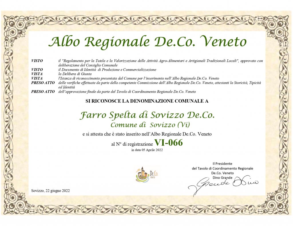 Il Farro Spelta è un cereale di origini antichissime, proveniente dal Medio Oriente, tanto che si parla di una sua presenza addirittura nel Neolitico e da secoli ha rappresentato la base della cucina delle popolazioni mediterranee. Dal 2015 il Comune di Sovizzo ha dato il via all’iter che ha portato questo cereale all’iscrizione al Registro dei prodotti De.Co. “Il lavoro è stato lungo e complesso – spiega l’assessore alle Attività Produttive Denise Pastorello – poiché siamo partiti proprio dalla ricerca e selezione del seme, alla sua coltivazione fino a stabilizzarne la produzione mantenendone ed esaltandone le caratteristiche organolettiche che ci hanno portato al suo riconoscimento come prodotto De.Co. di Sovizzo.” Molta parte in questa avventura l’ha avuta anche l’ufficio tecnico comunale, nella persona del responsabile, il geometra Edoardo Bacchiocchi, che ha da subito creduto nel progetto e l’ha non solo avviato, ma seguito e incrementato fino alla fine. A fare da apripista un gruppo di giovani, capitanati da Filippo Tonello, che attraverso l’Associazione “Terre di Sovizzo” si occupa della coltivazione del Farro Spelta in terreni di loro proprietà, riutilizzando anche aree marginali da tempo non coltivate. Alla sua diffusione, poi, concorrono esercizi commerciali locali che lo vendono sotto forma di chicchi per zuppe, pasta, gallette, biscotti, farina e pizze. Il riconoscimento della De.Co. è stato sancito lo scorso 15 marzo, ma la vera investitura, alla presenza dei presidenti del Tavolo provinciale De.Co. Riccardo Lotto e di quello regionale, Dino Grande, è avvenuta in occasione della Cena di Inizio estate organizzata dalle Associazioni “Le Attività di Sovizzo” e “Le Terre di Sovizzo” con il patrocinio del Comune di Sovizzo, mercoledì 22 giugno in piazza Manzoni. In quell’occasione, sono state anche premiate, dall’Amministrazione Comunale, le botteghe storiche locali con più di 50 anni di attività svolta a Sovizzo. “L’iter burocratico per il Farro Spelta è stato impegnativo – ricorda l’assessore Pastorello – ma il risultato è frutto di un lavoro collettivo che ha unito ancora di più la nostra comunità e soprattutto apre una nuova stagione per il nostro territorio, poiché istituire una De.Co. significa difendere e promuovere le eccellenze locali che porteranno nuovo lavoro e benessere.” Alla cena di investitura, il menu, ovviamente, è stato a base di prodotti realizzati con Farro Spelta, con una interessante sequenza di piatti. Dopo il benvenuto a base di crostini di pane al Farro Spelta accompagnati da baccalà mantecato, salumi e giardiniera locale, un tortino alle zucchine sovizzesi come antipasto. Il tortello al Farro Spelta farcito di formaggi del Colle su crema di piselli dolci e padellata di champignon freschi ha preceduto un filetto di maialino cotto a bassa temperatura su terra di Farro Spelta con verdure croccanti e patate nocciola. Al termine, gelato al vino Torcolato, miele d’ acacia, con piccoli frutti e Farro Spelta soffiato.