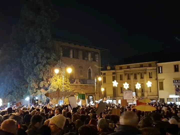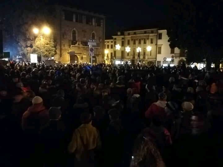Almeno 8-9 mila persone, circa 12 mila secondo i promotori, hanno partecipato questa sera al “Flash Mob” organizzato dal “popolo delle sardine” a Vicenza, in quello che ha rappresentato il primo evento del gruppo nel capoluogo berico.La manifestazione si è tenuta in piazza Matteotti, davanti a Palazzo Chiericati e a fianco del teatro Olimpico, che è risultato troppo piccola per ospitare tutti i partecipanti: alcune migliaia di persone si sono, infatti fermate lungo corso Palladio, incapaci di raggiungere il ‘cuore’ dell’evento.