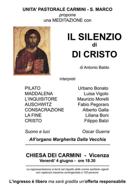 L’attenuarsi della pandemia da Covid 19 permette le prime iniziative d’incontro comunitario, sia pure con i sacrosanti limiti delle norme sanitarie. Tra i primi ad attivarsi è l’unità pastorale Carmini/S. Marco di Vicenza che propone – per venerdì 4 giugno, alle ore 18,30, presso la chiesa dei Carmini – una rappresentazione dal titolo “Il silenzio di Cristo”.