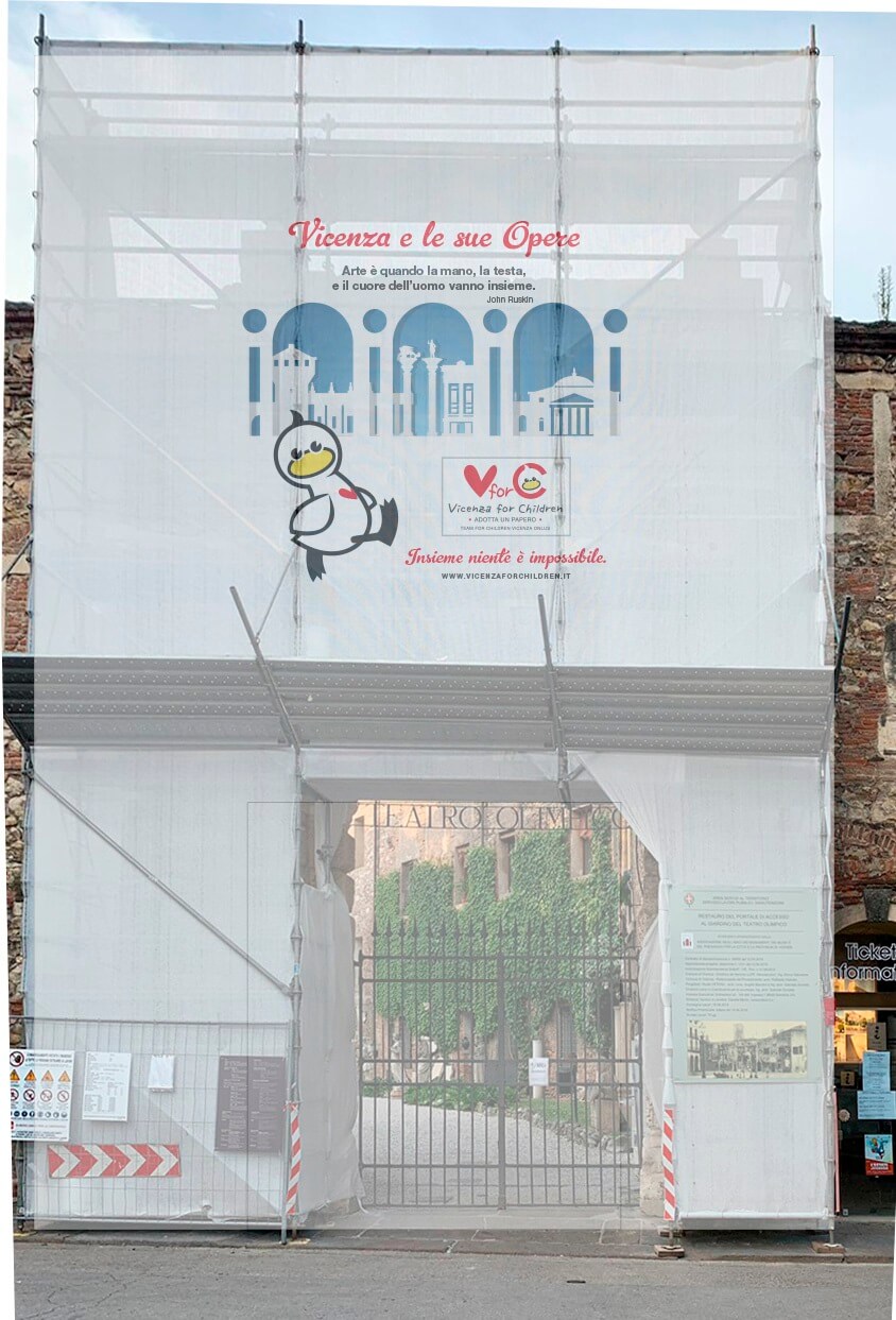 Il Teatro Olimpico si veste di solidarietà con Vicenza for children. Da oggi, intorno alle 15, infatti, di fronte all’ingresso di una tra le più celebri opere palladiane verrà installata una maxi copertura dell’impalcatura. Il Comune di Vicenza ha deciso di dare visibilità ad un’Associazione da sempre impegnata nel e per il territorio, Vicenza for children.