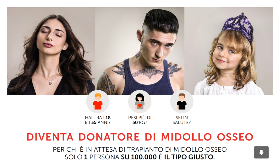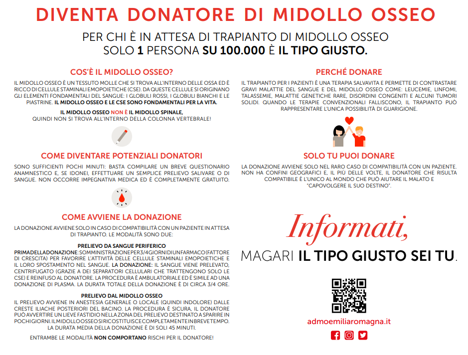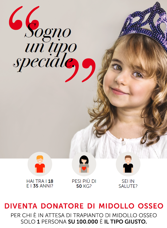 “Se hai tra i 18 e i 35 anni, pesi almeno 50 kg e sei in buona salute contatta il centro trasfusionale più vicino o noi di Admo che ti aiuteremo a fissare l’appuntamento e con un semplice esame del sangue entrerai nel registro dei donatori di midollo osseo. Se ti troveranno compatibile con una di queste 4 persone o con altre verrai chiamato a fare degli ulteriori accertamenti per verificare l’effettiva compatibilità ed effettuare nel caso il trapianto di midollo osseo, che negli ultimi anni viene realizzato,