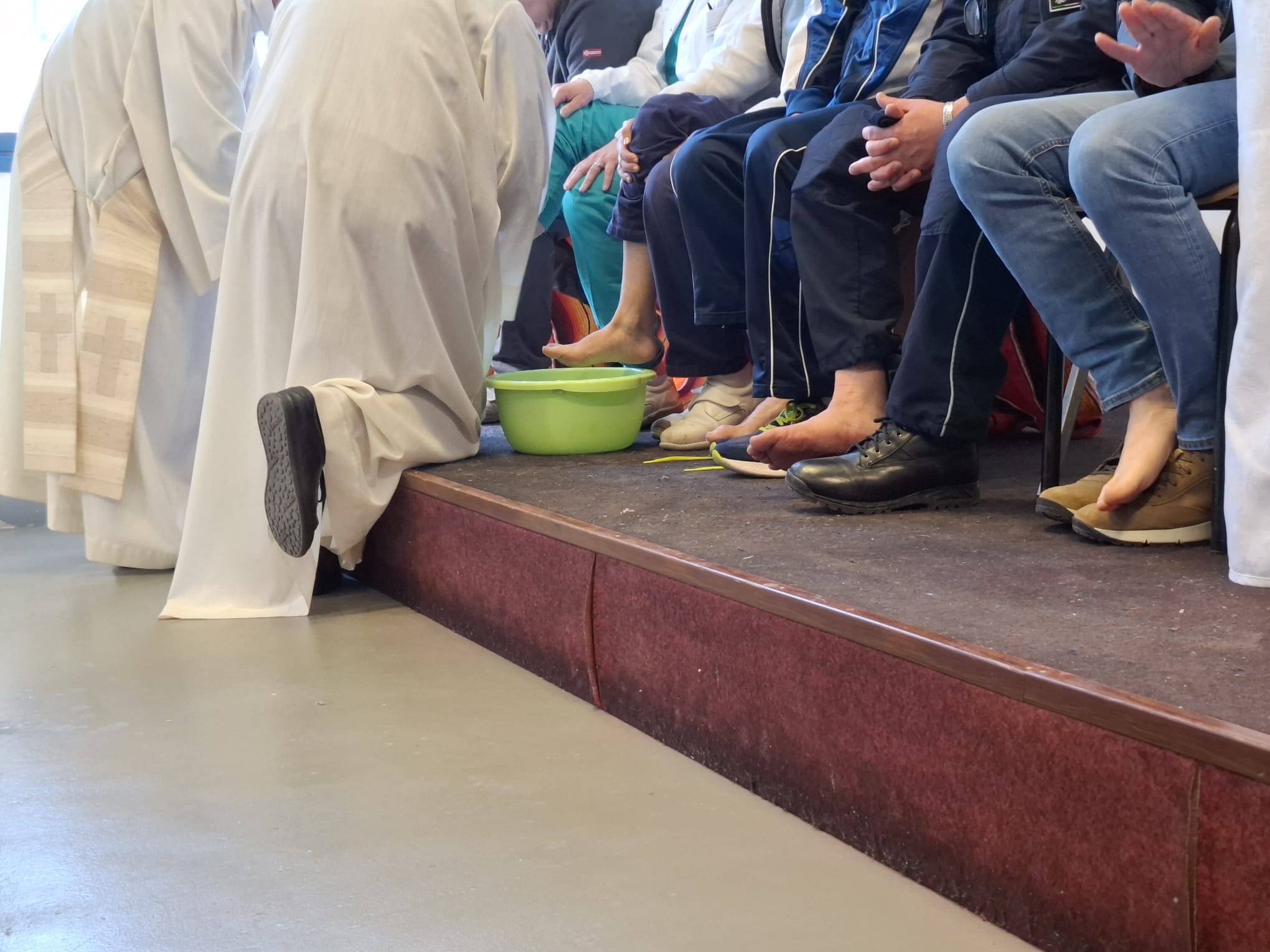 Durante la Messa, il Vescovo ha compiuto il forte gesto simbolico della lavanda dei piedi ad alcuni detenuti e a rappresentanti delle diverse realtà presenti in carcere: due infermiere, un funzionario del comparto funzioni centrali, un volontario e un agente di polizia penitenziaria. Don Maistrello ha spiegato il significato del gesto come invito ad «aiutarci gli uni gli altri, qui in carcere, ma anche fuori».
