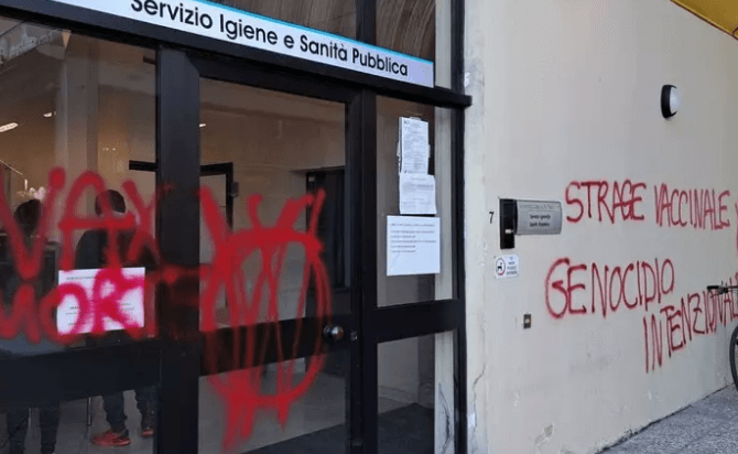 strage vaccinale genocidio internazionale”, questo il tenore degli slogan lasciati dagli attivisti. Su quanto è accaduto sta indagando la Digos della Questura di Vicenza. ANSA VENETO