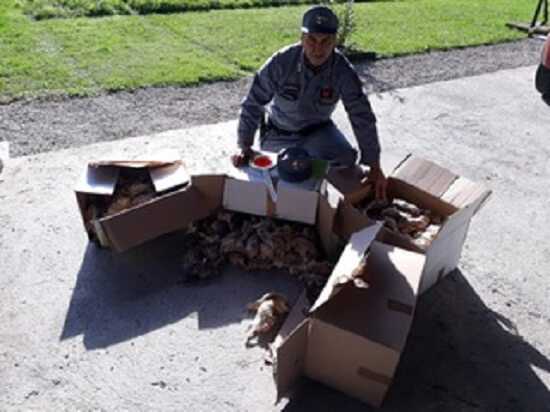 Durante un’ispezione dell’autovettura i Carabinieri hanno notato alcuni scatoloni, al cui interno vi erano numerose quaglie morte ed un esemplare di falco: vista la particolarità della situazione hanno quindi richiesto immediato supporto di alcuni colleghi della Stazione Carabinieri Forestali di Enego.