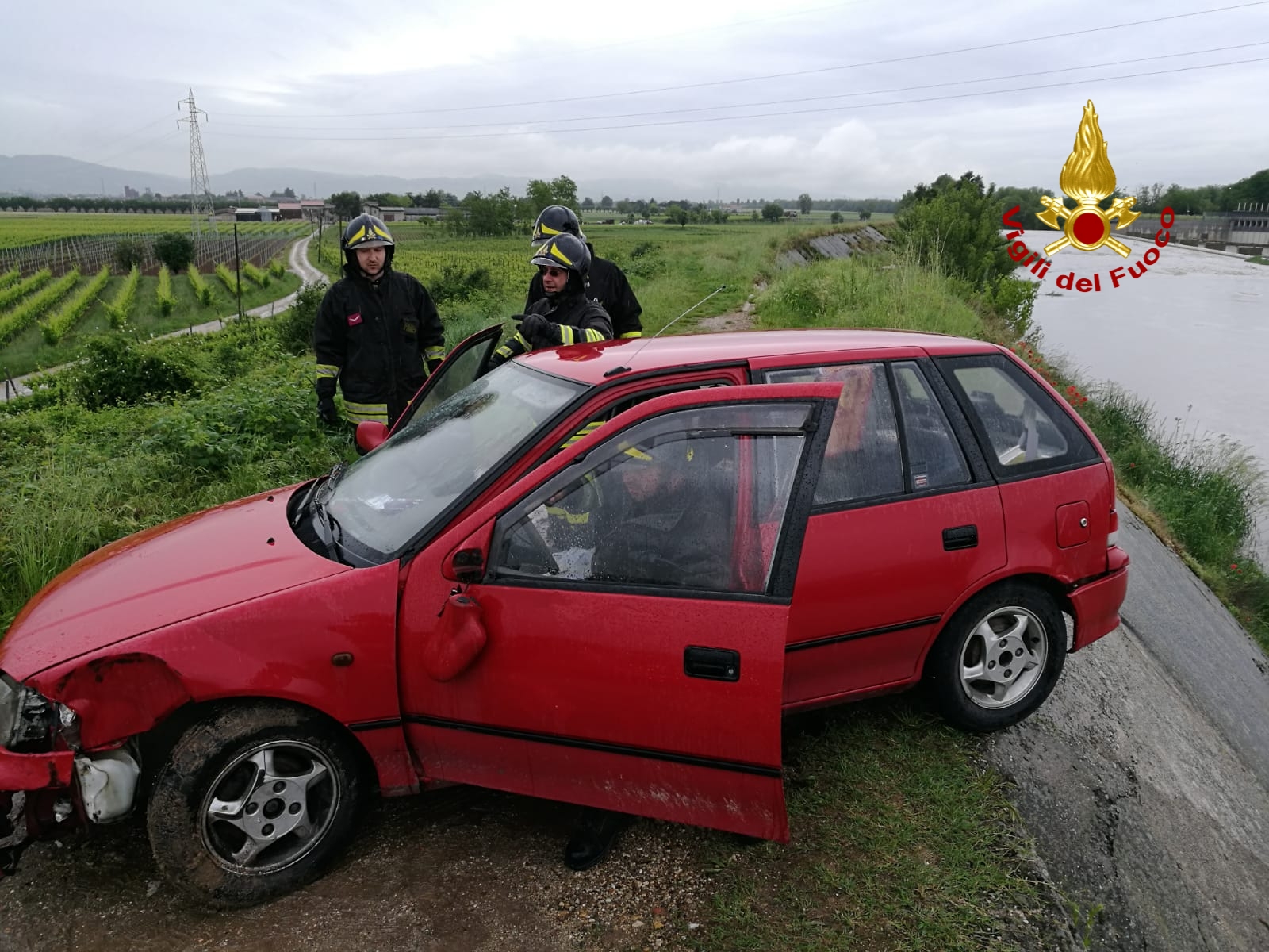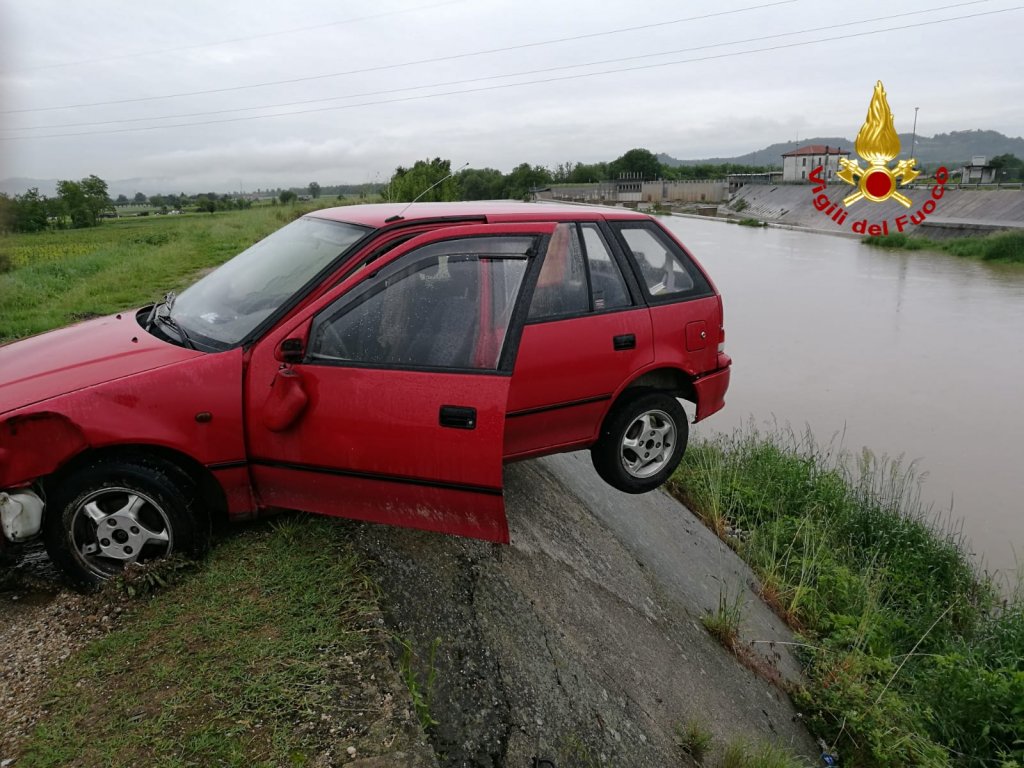 I vigili del fuoco intanto arrivati, allertati dai carabinieri, hanno  prestato soccorso all’uomo del tutto bagnato asciugandolo e mettendolo al caldo in camion, mentre altro personale assicurava l’auto a un punto fisso per evitare la caduta nel torrente.  Il malcapitato, come si è appreso successivamente, dopo essere finito fuori strada nell’uscire dell’auto è caduto nel fiume riuscendo autonomamente  a risalire l’argine, e sotto shock e senza rendersi conto della pericolosità, è risalito in auto. Le operazioni di soccorso sono terminate dopo circa un’ora e mezza con il recupero dell’auto da parte del soccorso stradale.