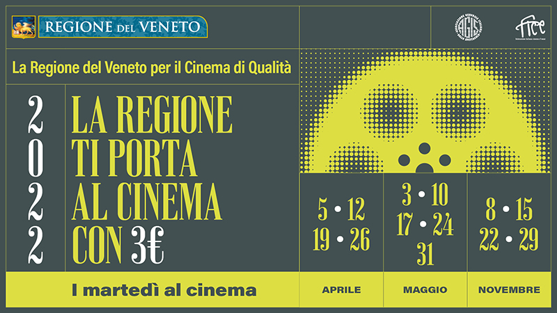 Ad aprile, maggio e novembre 2022 torna, nelle ventinove sale cinematografiche venete aderenti, l’edizione 2022 de “La Regione del Veneto per il cinema di qualità – La Regione ti porta al cinema con tre euro – I martedì al cinema”, progetto pluriennale della Regione del Veneto realizzato in collaborazione con la Federazione Italiana Cinema d’Essai (FICE) delle Tre Venezie e l’Unione interregionale Triveneta AGIS.