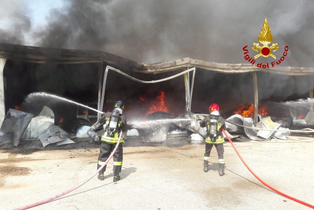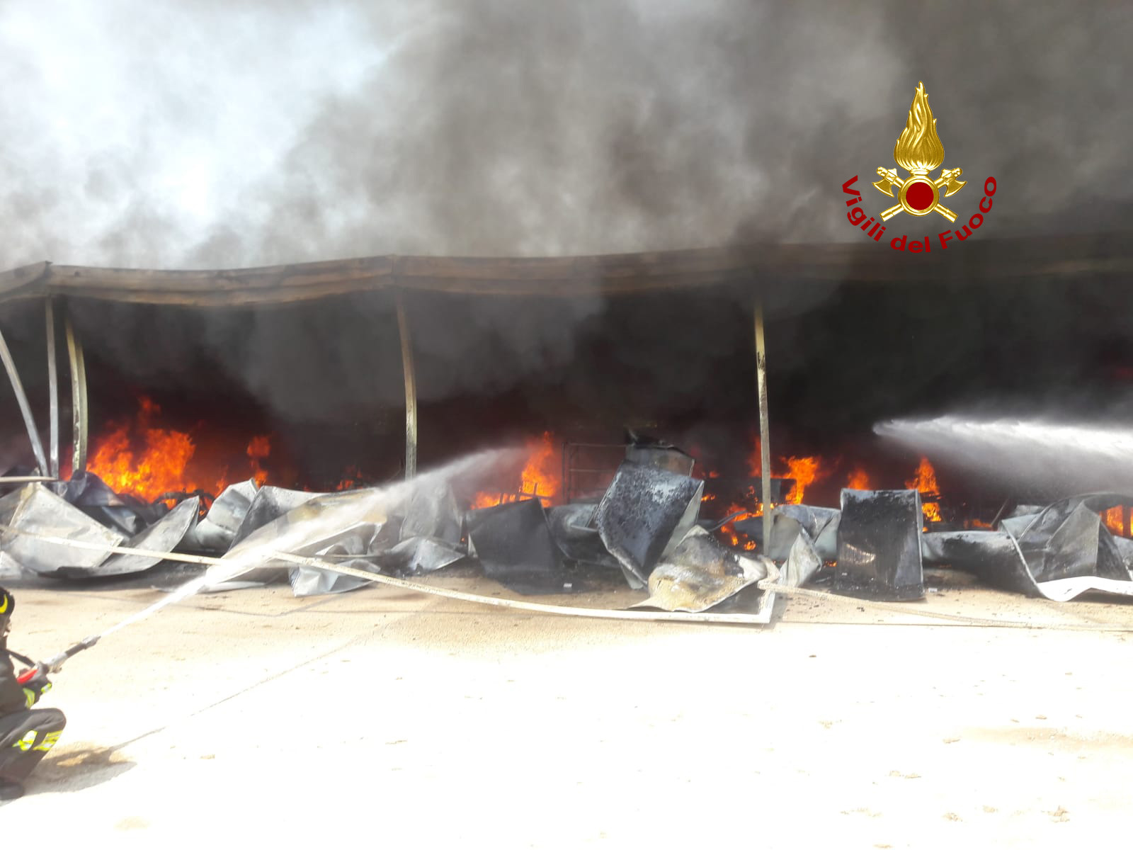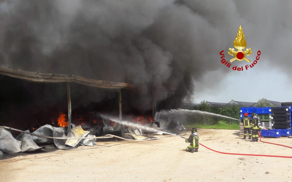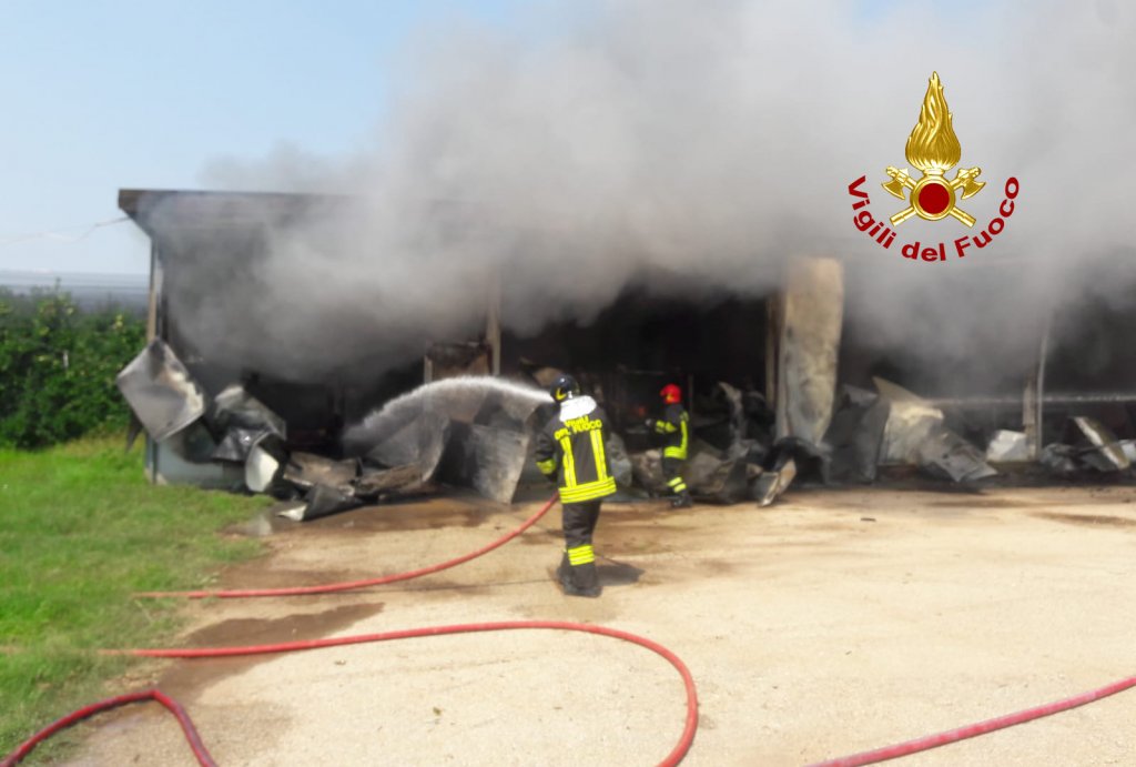 Numerose le chiamate alla sala operativa del 115 per l’alta colonna di fumo nero visibile a chilometri di distanza. All’arrivo delle squadre dei vigili del fuoco accorse da Lonigo, Vicenza e Este con due autopompe, due autobotti e dodici operatori, la struttura di circa 250 mq era completamente avvolta dalle fiamme. Bruciati completamente tre trattori, due muletti, due carri raccolta frutta, varie attrezzature agricole più un deposito di materiale antiparassitario. Completamente danneggiata la struttura del capannone in metallo e lamiera. Ingenti i danni. Le cause del rogo sono al vaglio dei tecnici dei vigili del fuoco. Sul posto l’Arpav e i carabinieri. Le operazioni di completo spegnimento e raffreddamento della struttura sono terminate dopo circa 4 ore.