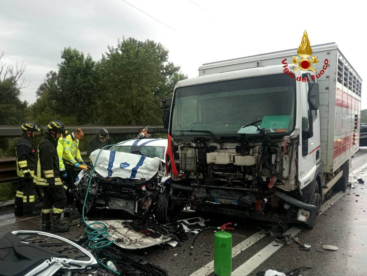 Illeso invece il conducente del mezzo pesante, adibito al trasporto di animali vivi. Le operazioni di soccorso e messa in sicurezza dell’area sono durate circa un’ora e mezza. Le cause dell’incidente sono ora al vaglio dei tecnici dei Vigili del fuoco.