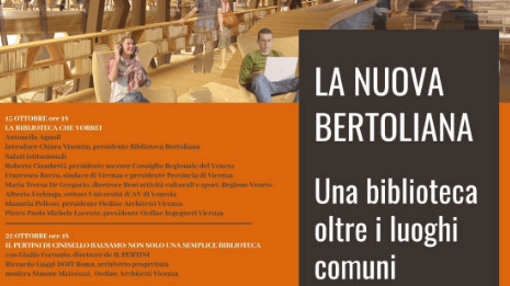 Si inaugura il 15 ottobre il ciclo di sei seminari aperti alla città “La Nuova Bertoliana: una Biblioteca oltre i luoghi comuni”, una serie di incontri “attivi e partecipativi” per presentare alla città di Vicenza modelli di nuove biblioteche realizzate in Italia. E’ il punto di partenza per un lavoro di progettazione della nuova biblioteca che l’amministrazione comunale ha organizzato per la riconversione del grande immobile dell’ex Tribunale a Santa Corona e per il quale la Bertoliana redigerà il progetto biblioteconomico.