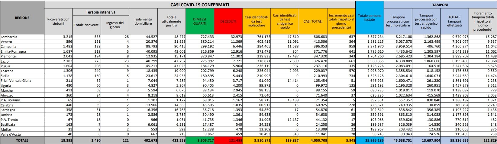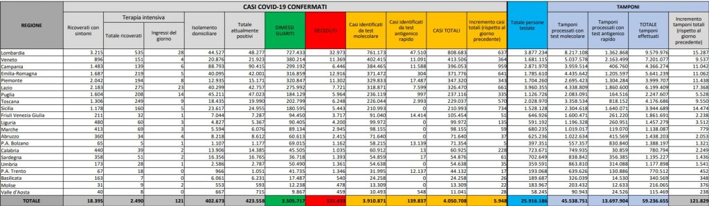 I nuovi contagiati sono 5.948 (tasso di positività in calo al 4,88%)