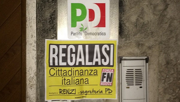 Con un comunicato Forza Nuova di Vicenza documenta l’iniziativa della scorsa notte, quando alcuni militanti del movimento hanno affisso nel comune di Vicenza e sui portoni delle sedi del Partito Democratico nei comuni della provincia tra i quali Thiene, Schio e Arzignano, alcuni cartelli polemici nei confronti della recente votazione positiva, avvenuta alla Camera, sul disegno di legge che vorrebbe introdurre la cittadinanza breve agli immigrati, fondandola sui criteri dello Ius Soli e dello Ius Culturae.