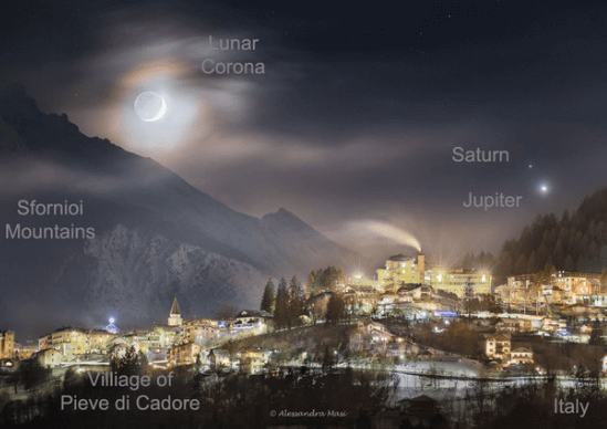 E’ il primo scatto astronomico italiano selezionato dalla Nasa del 2021. Un riconoscimento toccato a 6 astrofotografi italiani nel 2020. L’effetto della corona lunare, spiega la Nasa, è creato dal meccanismo di diffrazione della luce attorno alle gocce d’acqua presenti in strati nuvolosi, per lo più trasparenti e sottili, e che può essere visto facilmente a occhio nudo. La foto è stata realizzata pochi giorni della grande congiunzione di Giove e Saturno del 21 dicembre.