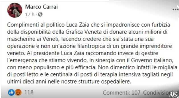 Assolutamente irricevibile è la citazione di un dato di partenza riferito al 2002, ben 18 anni fa e in un contesto nemmeno lontanamente paragonabile a quello attuale caratterizzato da un’infinità di innovazioni tecnologiche e scientifiche, ma addirittura errato è il dato riferito al 2013 in relazione al 2019. Nella realtà, facilmente verificabile dai numeri ufficiali, i posti letto di terapia intensiva, in Veneto, sono aumentati di 10 unità: dai 939 delle schede del 2013, ai 949 delle schede 2019. Il meno 39% segnalato nella tabella de “Il Veneto che Vogliamo” è da considerarsi semplicemente falso, falsato da una lettura quanto meno superficiale dei dati.