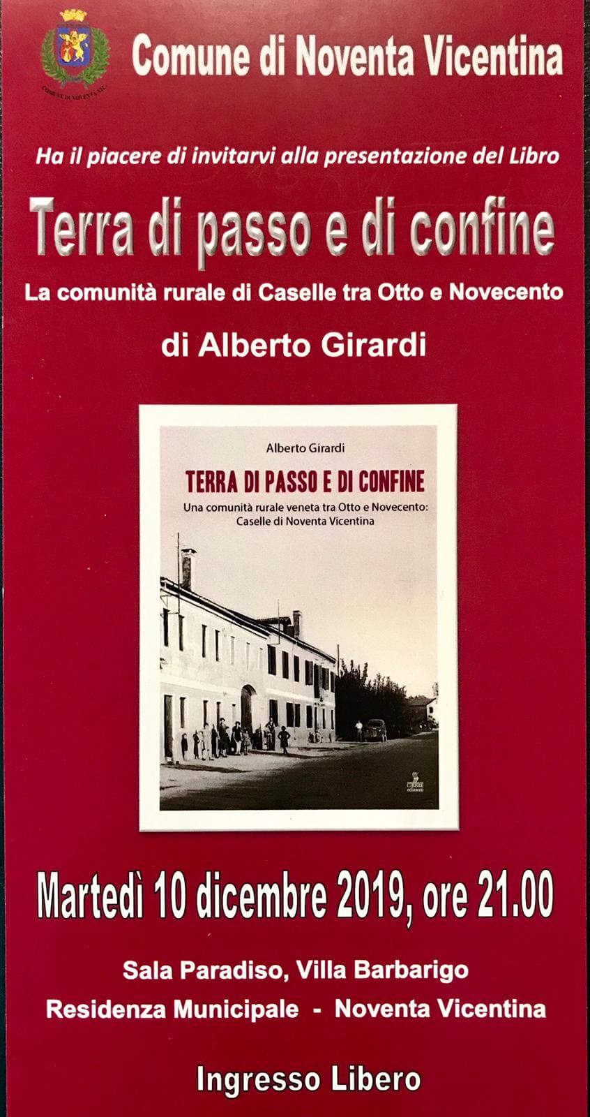 Per chi non avesse ancora avuto il piacere di conoscere la storia e le tradizioni di “Caselle” e per chi volesse ascoltare i racconti e gli aneddoti del territorio, stasera alle ore 21 presso la Sala Paradiso di villa Barbarigo a Noventa Vicentina verrà presentato “Terra di passo e di confine – La comunità rurale di Caselle tra otto e novecento” di Alberto Girardi.