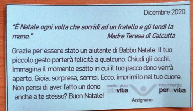 “Chi si impegna nel volontariato lo fa sia per rispondere ai bisogni della comunità, sia per soddisfare bisogni e desideri personali.Immagina il momento esatto in cui il tuo pacco dono verrà aperto. Imprimilo nel tuo cuore”. Non pensi di aver fatto un dono anche a te stesso? “La risposta più bella l’hanno data proprio i bambini, veri protagonisti di questa iniziativa, rimasti a bocca aperta: “Sembra la casa di Babbo Natale”.E’ proprio lì che volevamo arrivare” – conclude Dalla Fina.