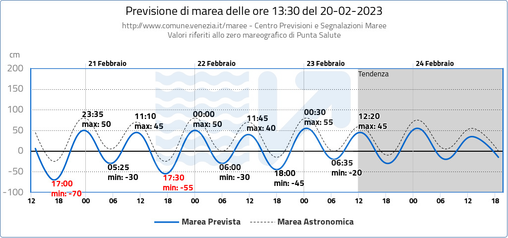 Il fenomeno delle maree basse è stato poco frequente negli ultimi anni. Il record negativo si raggiunse nel 1934 con -121 cm rispetto allo zero mareografico mentre nel 1989 si raggiunsero i -92 cm.