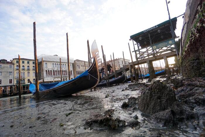 Il romanticismo di Venezia svanisce in questo giorni a causa delle condizioni climatiche straordinarie, che hanno provocato una bassa marea record (-66cm rispetto allo zero mareografico) e ha letteralmente prosciugato i canali, esponendo fondi fangosi e poco eleganti fondamenta. Una situazione determinata non dalla siccità, ma dall’alta pressione che insiste sulla regione e continuerà almeno fino a martedì con un picco minimo domani, secondo il bollettino dell’Ufficio Maree del Comune. La situazione sta creando non pochi problemi alla navigabilità anche nei canali principali.