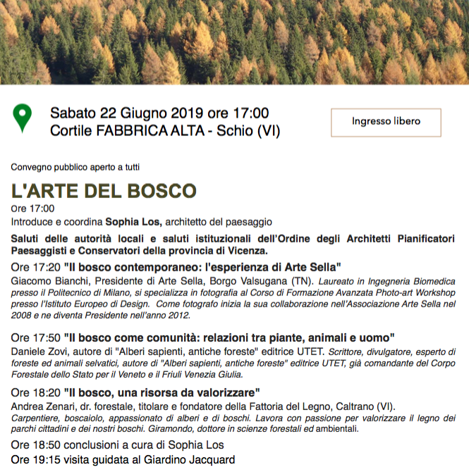 Ne parliamo con Giacomo Bianchi Presidente di Arte Sella, Daniele Zovi, autore di “Alberi sapienti, antiche foreste” editrice UTET, Andrea Zenari della Fattoria del Legno, moderatore Sophia Los architetto e paesaggista. Al termine del convegno sarà possibile partecipare ad una visita guidata al riaperto Giardino Jacquard.