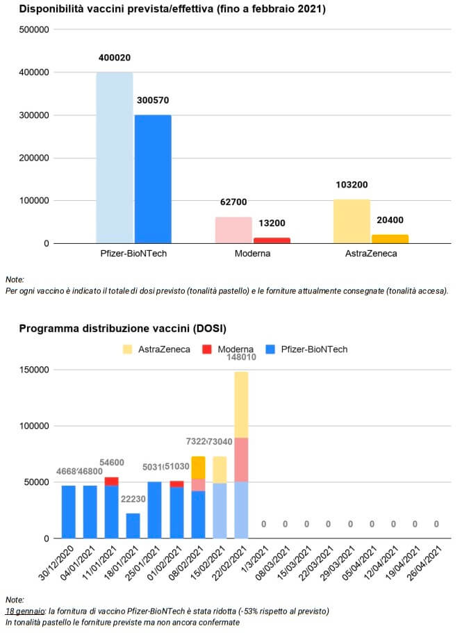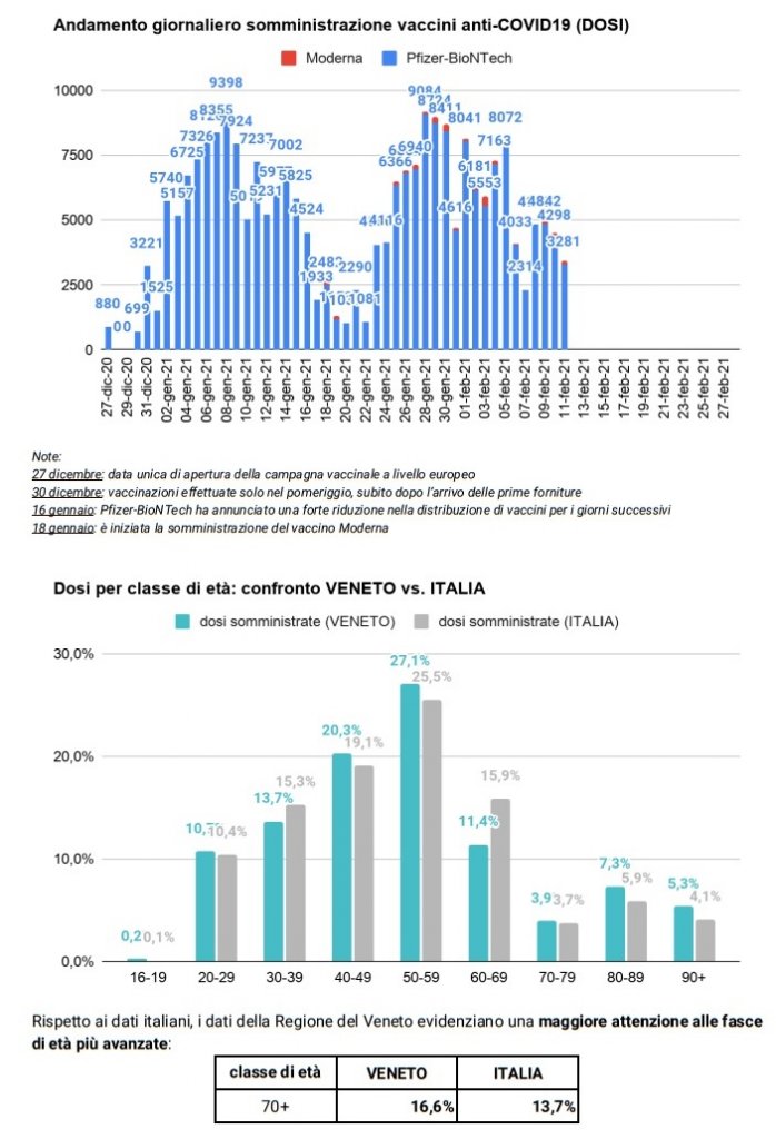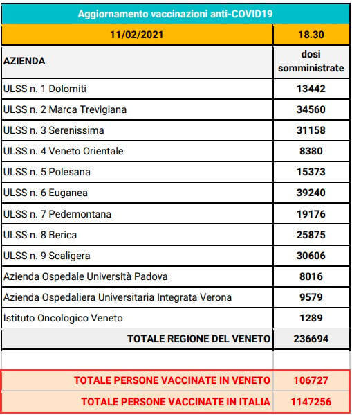 Nelle seguenti tabelle vi è il punto sulle vaccinazioni in Veneto. Sono state somministrate quasi 240 mila dosi e le persone finora vaccinate sono 106 mila.