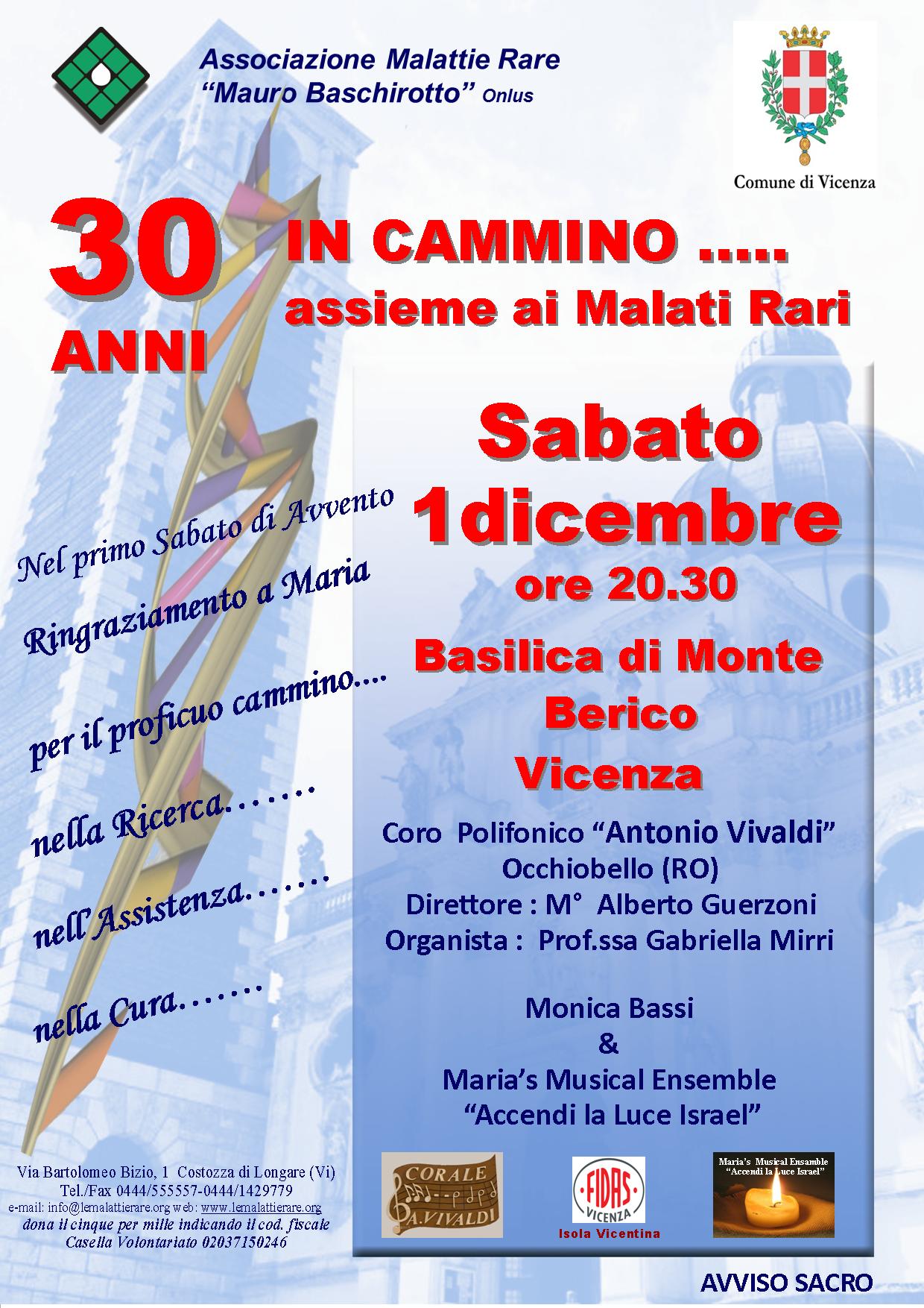 In occasione del trentesimo compleanno l’Associazione Malattie Rare “Mauro Baschirotto” ha organizzato un evento di particolare suggestione, per testimoniare questo importante traguardo. L’Associazione, ideata, voluta e fondata Anna e Giuseppe Baschirotto è stata la prima in Italia ad occuparsi di Malattie Rare nel lontano 1988, un anno dopo la morte del figlio Mauro. L’Associazione ha iniziato a dedicarsi, e si dedica tutt’ora, all’assistenza all’informazione, ricerca e cura di quelle malattie, 8000 ormai quelle conosciute, caratterizzate da difficoltà diagnostiche e terapeutiche a volte insormontabili e che comportano un elevatissimo carico gestionale ed emotivo ai malati e alle famiglie. Moltissimi i progetti, le iniziative, le attività assistenziali realizzate in questo lungo cammino assieme ai Malati Rari, e alle loro famiglie, che si trovano quotidianamente a confrontarsi con la propria realtà alla ricerca di speranza nuova per condividere nuova fiducia. In particolare sabato 1° dicembre alle ore 20.30 avrà luogo presso la Basilica di Monte Berico in Vicenza il concerto del Coro Polifonico “Antonio Vivaldi“ da Occhiobello in provincia di Rovigo e del Soprano Monica Bassi assieme al Coro “Accendi la Luce Israel” accompagnati dal gruppo “Maria’s Musical Ensamble”. Il Concerto è patrocinato dal Comune di Vicenza. La Corale “Antonio Vivaldi” nasce nel 1980 grazie ad un gruppo di appassionati del canto e si limita inizialmente ad animare la liturgia. Dal 1990 la Corale si arricchisce con la direzione del M° Alberto Guerzoni, concertista e compositore che ha ampliato il repertorio della corale con brani operistici, gospel e composizioni sacre molto apprezzate: Gloria di Vivaldi, pagine musicali di Mozart, Bach, Gounod e altri compositori. Dal 2004 la corale ha assunto il nome di “Coro Polifonico Antonio Vivaldi” con un proprio statuto. La corale ha partecipato a numerose rassegne, ed è stata invitata ad eseguire concerti in Duomo a Ferrara, Rovigo, Padova, Ravenna, Montecatini Terme, Forte dei Marmi, Santuario Madonna delle Grazie di San Giovanni Rotondo, Pietrelcina, Chiesa di San Marco al Campidoglio a Roma, Chiesa della Verna in Arezzo ecc. Si è inoltre esibita all’estero al Teatro di Mennecy (Francia) e nella Chiesa Evangelica di Renningen (Germania). Il coro si compone di circa 35 elementi e si avvale della collaborazione del soprano Rossana Antonioli e della Prof.ssa Gabriella Mirri in qualità di pianista accompagnatrice. Dal 2005 la corale propone nella città di Rovigo, un concerto di Natale per coro, orchestra e solisti, concerto che richiama un numerosissimo pubblico da tutte le località vicine, molto apprezzato dal pubblico e dalla critica.