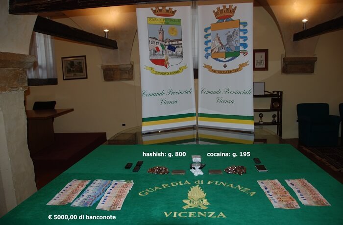 Subito dopo, i finanzieri hanno esteso la perquisizione anche all’abitazione in uso a E.S.K. dove sono stati trovati, anche grazie all’intervento dell’unità cinofila del Gruppo della Guardia di Finanza di Vicenza, altri 300 grammi di hashish, sia in ovuli che in “panetti” e 160 grammi di cocaina in “sasso”. In un armadio della camera da letto i finanzieri hanno trovato 5.000 euro in contanti, sequestrati insieme alla droga quale provento dell’attività di spaccio.