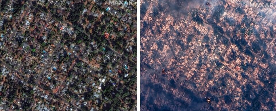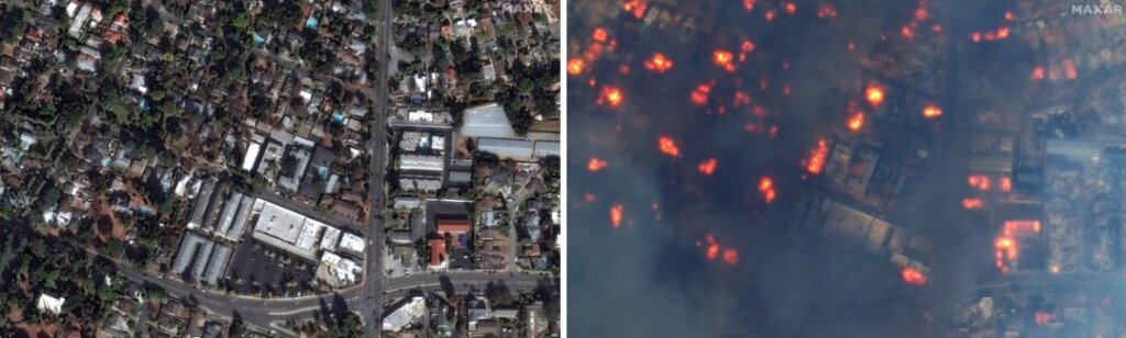 Immagini drammatiche e sorprendenti, catturate dal satellite di osservazione terrestre della società Maxar Technologies, mostrano l’entità dei danni causati dagli incendi che da 48 ore devastano Los Angeles e i suoi dintorni. Il fuoco, denominato Eaton, si estende su una superficie di 42 km² e ha completamente distrutto il quartiere di Altadena.