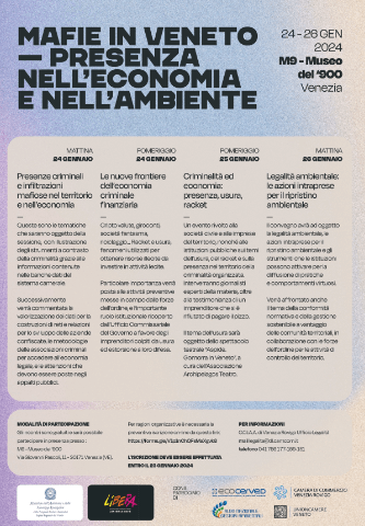 Si terrà il 24, 25, 26 gennaio, presso l’Auditorium Cesare De Michelis dell’M9 – Museo del ‘900 di Mestre, l’importante rassegna “Mafie in Veneto – Presenza nell’economia e nell’ambiente” organizzata dalla Sezione regionale del Veneto dell’Albo Gestori Ambientali assieme alla Camera di Commercio di Venezia Rovigo e LIBERA: Associazioni, nomi e numero contro le mafie A.P.S., con il patrocinio di Unioncamere del Veneto, Albo Nazionale Gestori Ambientali, Ecocerved Scarl e con la media partnership di Nord/Est Multimedia.