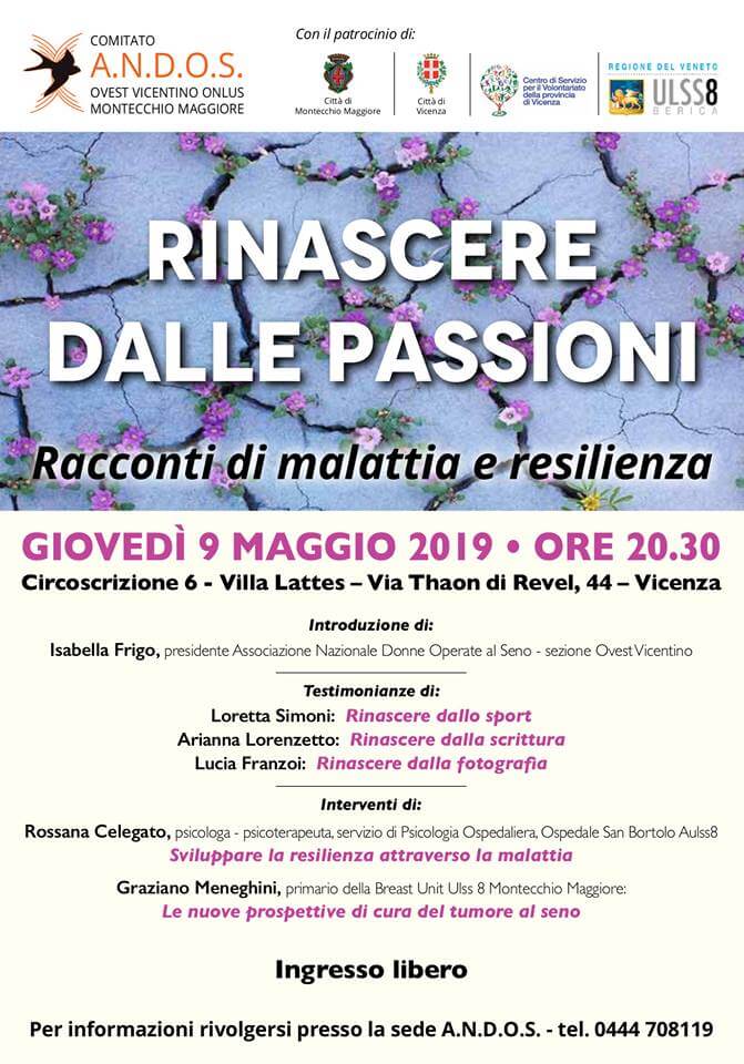 “Rinascere dalle passioni. Racconti di malattia e resilienza”. È questo il titolo dell’incontro con il Comitato ANDOS (Associazione Nazionale Donne Operate al Seno) Ovest Vicentino organizza per domani giovedì 9 maggio alle ore 20.30 in Villa Lattes a Vicenza (via Thaon di Revel, 44, Circoscrizione 6).