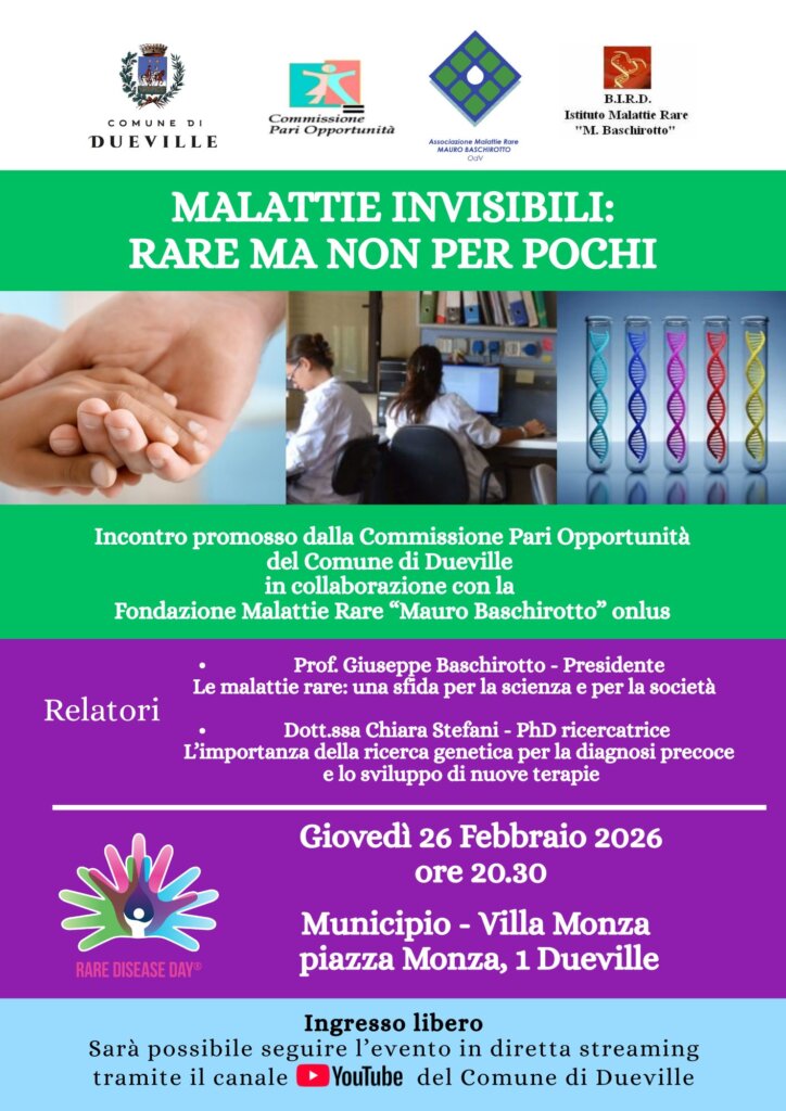 Accendere i riflettori su patologie poco conosciute ma tutt’altro che marginali: è questo l’obiettivo dell’incontro “Malattie rare, invisibili ma non per pochi”, promosso dalla Commissione Pari Opportunità del Comune di Dueville e in programma giovedì 26 febbraio in municipio, in collaborazione con l’Istituto Malattie Rare Mauro Baschirotto, realtà che da decenni si occupa di diagnosi, ricerca e cura delle malattie rare (sotto, la locandina dell’evento).
