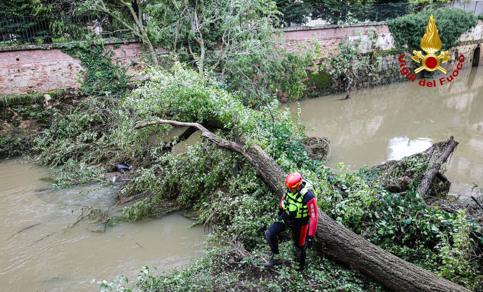 Due squadre dei vigili del fuoco con personale speleo alpino fluviale sono all’opera per tagliare i rami e i tronchi delle tra piante, che vengono man mano recuperati nei pressi degli archi del Ponte delle Barche, da un camion gru dotato di ragno.