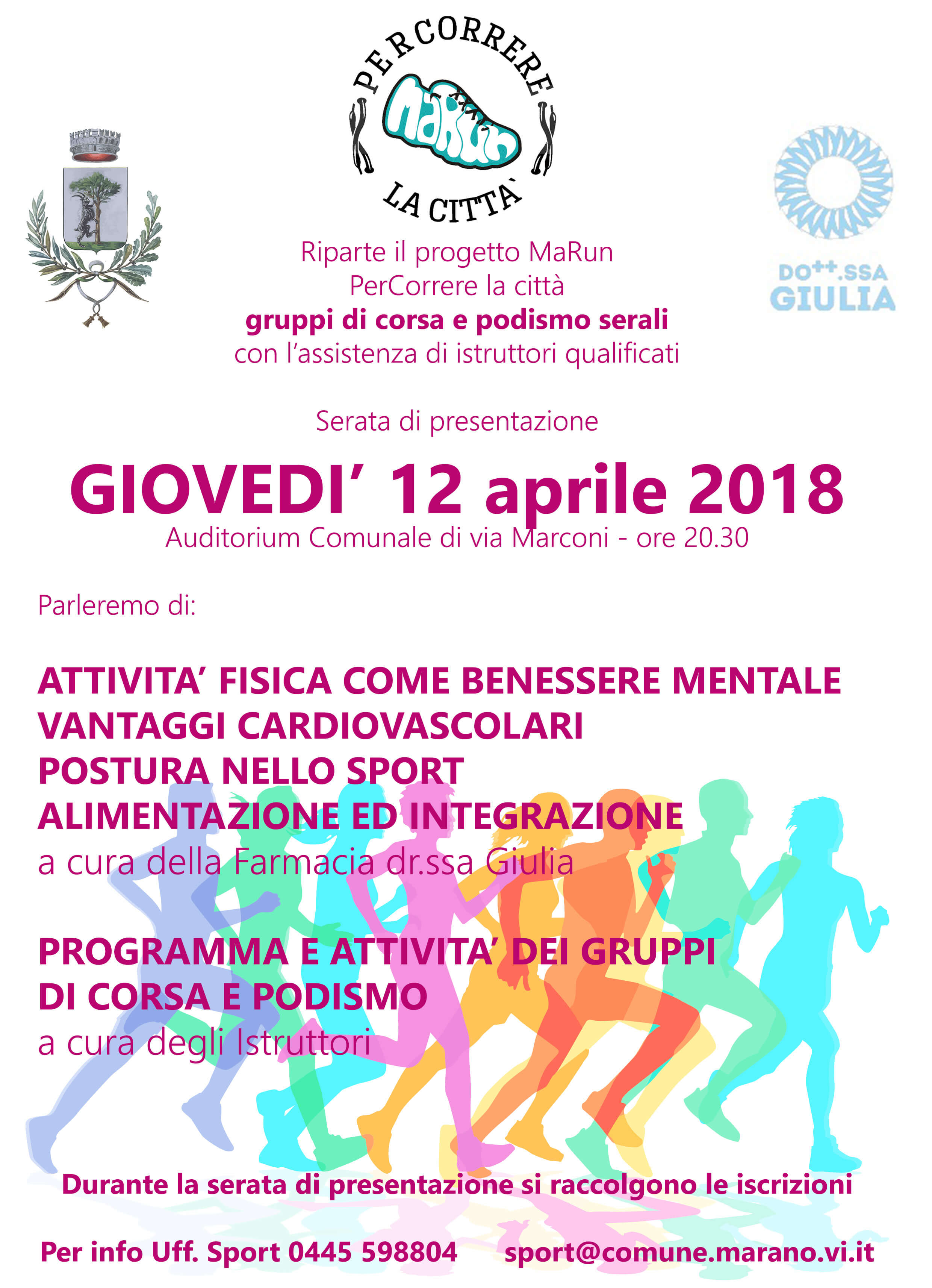 Con l’arrivo della bella stagione riparte il progetto “MaRun. PerCorrere la città”, con le attività dei gruppi di corsa e podismo serali, seguiti da istruttori qualificati. Le iniziative della nuova stagione saranno presentate ai cittadini giovedì 12 aprile, alle ore 20.30 in auditorium comunale a Marano. Durante la serata, in collaborazione con la nuova farmacia Dott.ssa Giulia, si parlerà dell’attività fisica collegata al benessere mentale, i vantaggi cardiovascolari della corsa, la postura nello sport e della corretta alimentazione per chi svolge attività fisica. Gli istruttori presenteranno poi il programma e le attività specifiche dei gruppi di corsa e podismo e si apriranno le iscrizioni ai corsi.