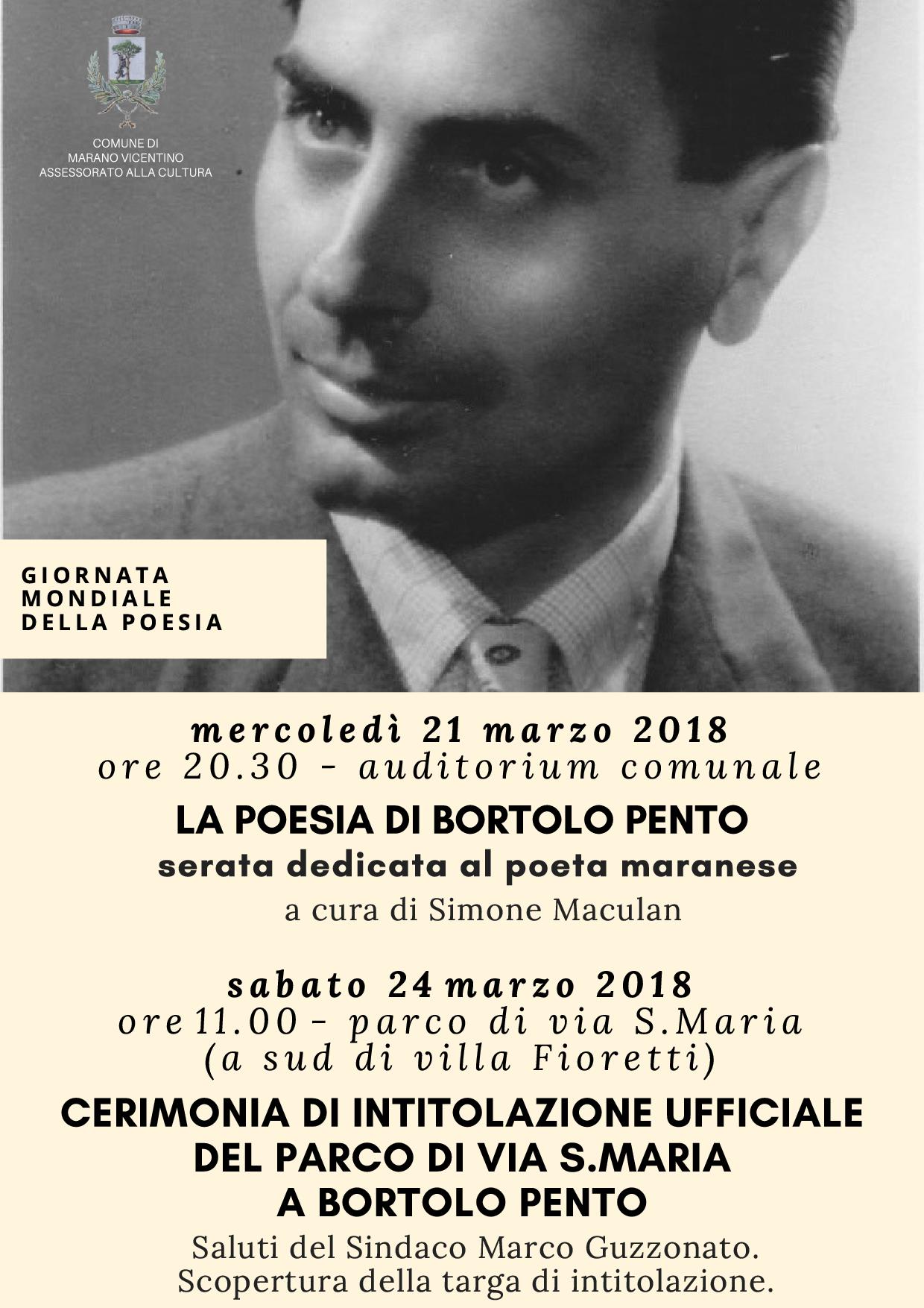 Oggi 21 marzo è la giornata mondiale della Poesia, istituita dall’Unesco nel 1999, e il Comune di Marano – con l’assessorato alla Cultura – non perde l’occasione per celebrare quest’arte che fa primavera. Per avvicinare i cittadini a questo genere letterario, il Comune ha promosso un progetto di “poesia urbana”. In alcuni luoghi del paese – la stazione dei treni, le fermate dei bus, la piazza, le scuole e la biblioteca – mercoledì 21 marzo saranno applicati degli stencil con brevi estratti di alcune famose poesie, scelte dal comitato Biblioteca e dagli studenti maranesi. L’obiettivo è far conoscere la poesia anche fuori dall’ambiente scolastico e accademico, a partire dal quotidiano, sfruttando anche il valore estetico di questa forma d’arte per abbellire il paesaggio urbano. “In qualche modo, vorremmo che le persone ‘inciampassero’ quotidianamente in brani poetici, ospitati lungo i marciapiedi e nei principali luoghi pubblici di Marano – spiega il sindaco, Marco Guzzonato -. E in occasione della giornata mondiale della poesia celebreremo anche il nostro poeta Bortolo Pento e la sua produzione artistica”. Sempre il 21 marzo, alle 20.30 in auditorium comunale, l’assessorato alla Cultura dedica una serata a ingresso libero al poeta maranese Bortolo Pento, a cura di Simone Maculan. Al poeta sarà poi dedicato sabato 24 marzo il parco di via santa Maria (a sud di villa Fioretti). La cerimonia è prevista per le ore 11.00, con i saluti del sindaco, Marco Guzzonato, e la scopertura della targa di intitolazione del parco a Bortolo Pento.
