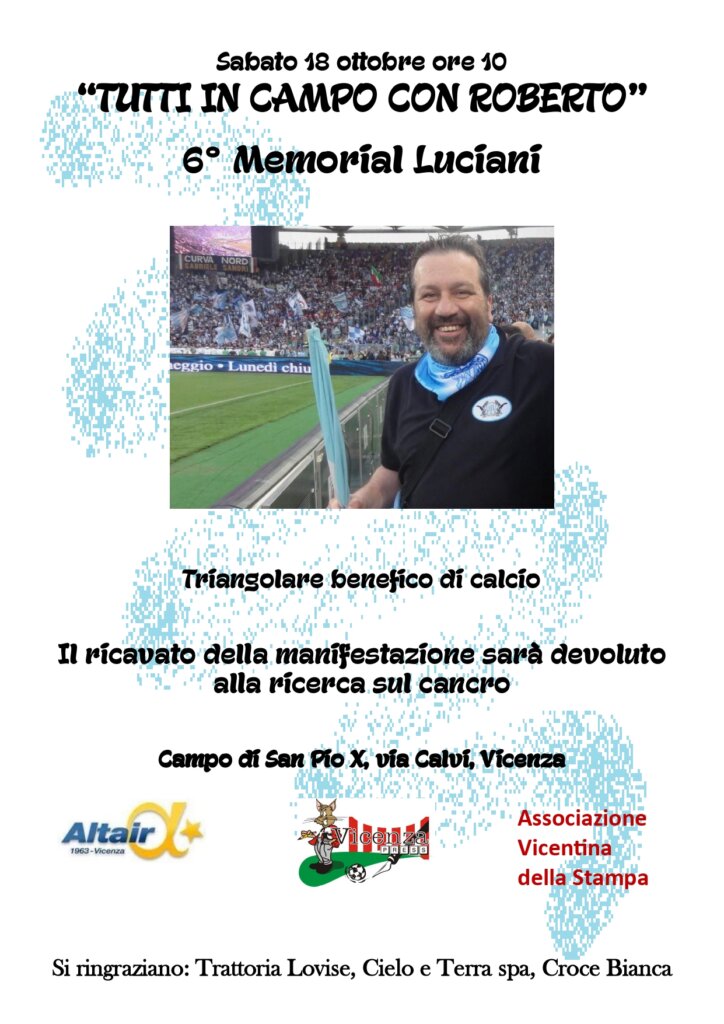 Ricorre quest’anno la sesta edizione del “Memorial Luciani – Tutti in campo con Roberto”che si terrà sabato 18 ottobre dalle ore 10 presso l’impianto sportivo San Pio X di via Calvi a Vicenza, grazie all’impegno di Vicenza Press e dell’Associazione Vicentina della Stampa. Un’occasione per ripensare a Roberto, che sicuramente si sarebbe divertito a vedere tanti colleghi e amici sfidarsi sul campo, qualcuno più allenato e altri a rincorrere il pallone solo per lui.