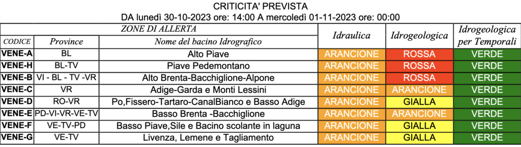 Considerati i fenomeni meteorologici previsti sul Veneto, il Centro Funzionale Decentrato della Protezione Civile regionale comunica che, per criticità idrogeologica, è stata dichiarata la fase operativa di “Allarme” (Rossa) dalle 14:00 di oggi fino alla mezzanotte di domani nei bacini idrografici VENE-A Alto Piave (BL), VENE H Piave Pedemontano (BL – TV), VENE B Alto Brenta-Bacchiglione-Alpone (VI – BL – TV –VR). Per la stessa criticità e negli stessi orari e stata dichiarata la fase operativa di “Preallarme” (Arancione) nei bacini VENE-C Adige-Garda e Monti Lessini (VR) e VENE-E Basso Brenta –Bacchiglione (PD-VI-VR-VE-TV). La fase di “Attenzione” (Gialla), invece, è stata dichiarata per VENE-D Po,Fissero-Tartaro-Canal Bianco e Basso Adige (RO-VR), VENE-F Basso Piave, Sile e Bacino scolante in laguna (VE-TV-PD), VENE-G Livenza, Lemene e Tagliamento (VE-TV).