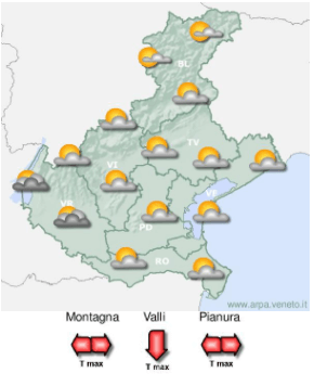 Temperature. In pianura in aumento di notte e in calo di giorno, leggero o moderato; sui monti generalmente in lieve aumento eccetto leggere diminuzioni dei valori notturni nelle valli.