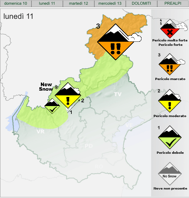 Nella serata di oggi il limite neve/pioggia si innalzerà di molto per arrivare fino a 1500-1800 metri in alcune vallate. A 2000 metri nelle Dolomiti, fra lunedì e martedì potranno cadere 50-100 cm di neve fresca. Nelle Prealpi il limite neve/pioggia si innalzerà presumibilmente già oggi. Questa nuova neve, soprattutto nella fascia altimetrica fra i 1500 e i 2200 metri, andrà a coprire strati di neve preesistenti fragili e pertanto il manto nevoso risulterà instabile. Le condizioni di pericolo valanghe per oggi è aumentato dall’1 di ieri a 3-marcato nelle Dolomiti e a 2-moderato nelle Prealpi. Lungo i pendii ripidi saranno da aspettarsi valanghe spontanee di neve fresca, specie nella fascia altimetrica fra i 1500 e i 2200 metri di quota. I distacchi provocati saranno possibili già con debole sovraccarico, anche lungo i ripidi pendii in mezzo al bosco. Nelle Prealpi, le condizioni di pericolo saranno in quota e in generale il grado sarà 2-moderato.