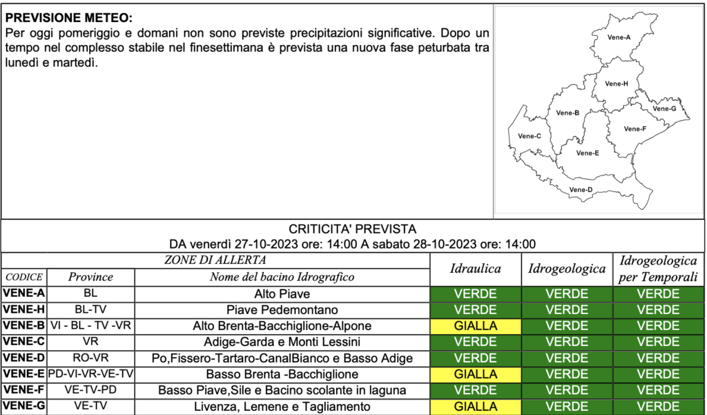 Per questo motivo, il Centro Funzionale Decentrato della Protezione Civile della Regione ha emesso un avviso di criticità determinando lo Stato di Attenzione (allerta gialla) sul bacino Alto Brenta-Bacchiglione-Alpone, sul bacino Basso Brenta-Bacchiglione e sul bacino Livenza-Lemene-Tagliamento.